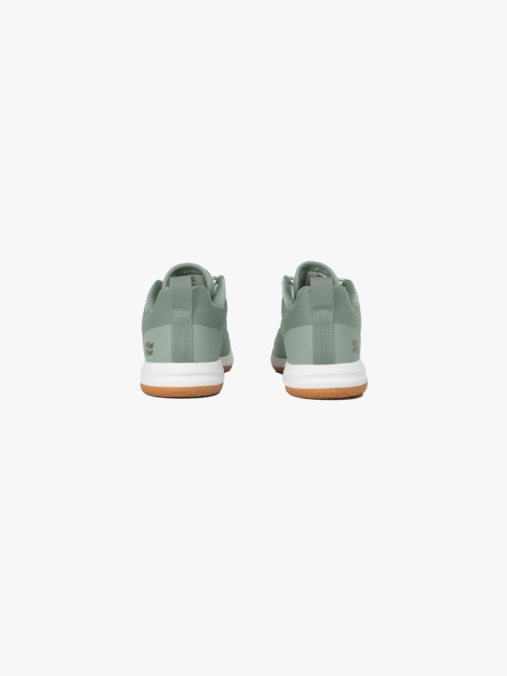 Versatile muted green upper with army logo package over white midsole and sticky gum rubber outsole.