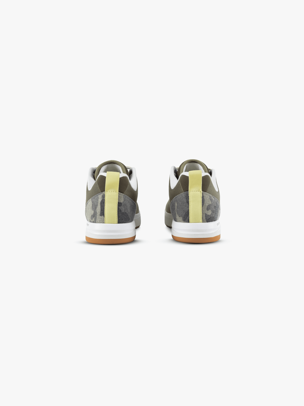 Custom camo printed upper with vintage two-tone white midsole and gum rubber outsole. Muted yellow contrast on heel pull and lace hits, with reflective silver flag logo on tongue.
