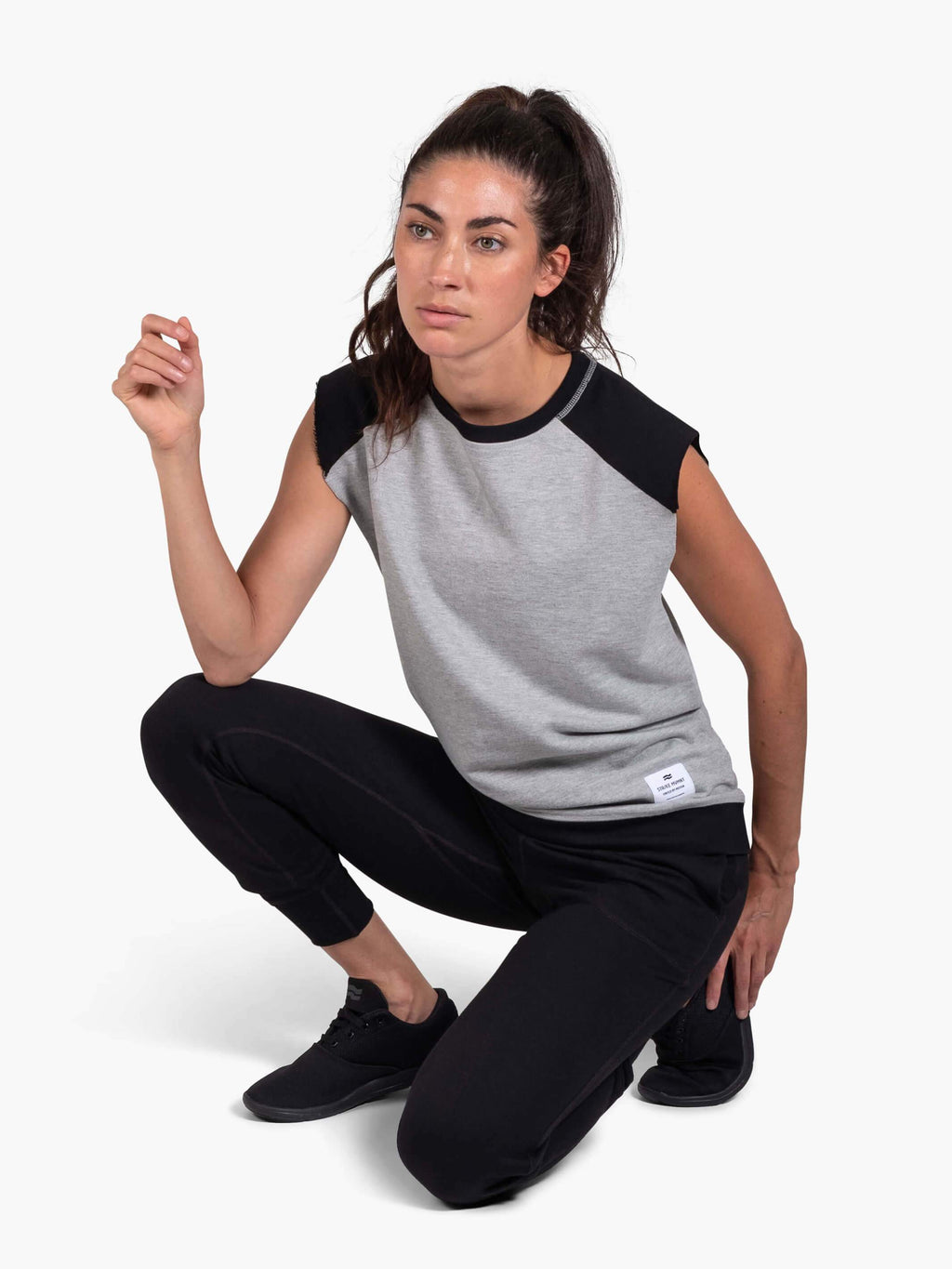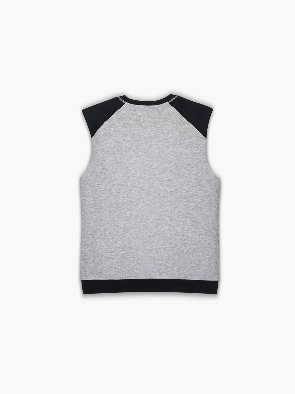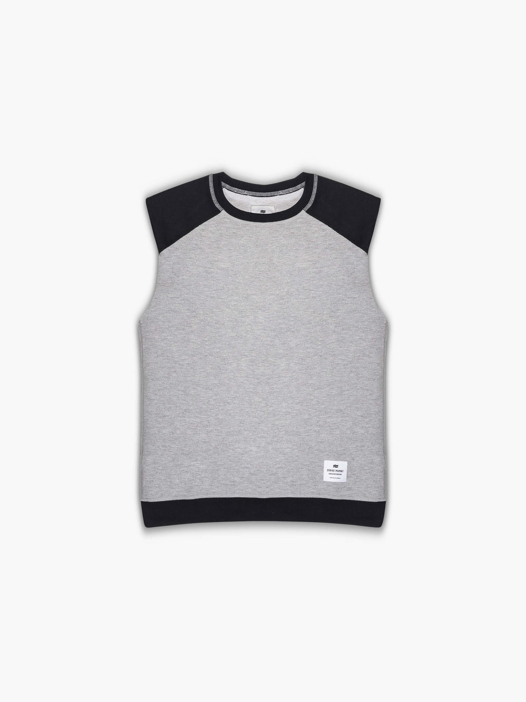 Sleeveless crewneck sweatshirt with raw edge arm openings. Keeps your core warm but with total upper body mobility and unrestricted range of motion.