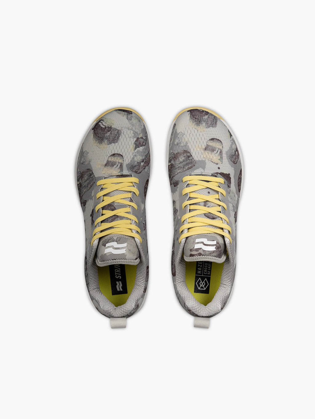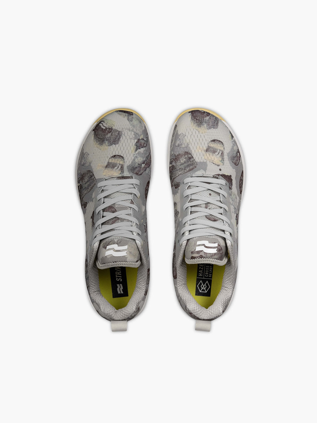 The Daub Camo pattern is unique to each pair and features earthy grey tones in a hand painted camouflage print. The Mellow Yellow outsole and matching primary shoelace highlights the pop of color. Comes with secondary shoelace in tonal grey for a more neutral aesthetic.
