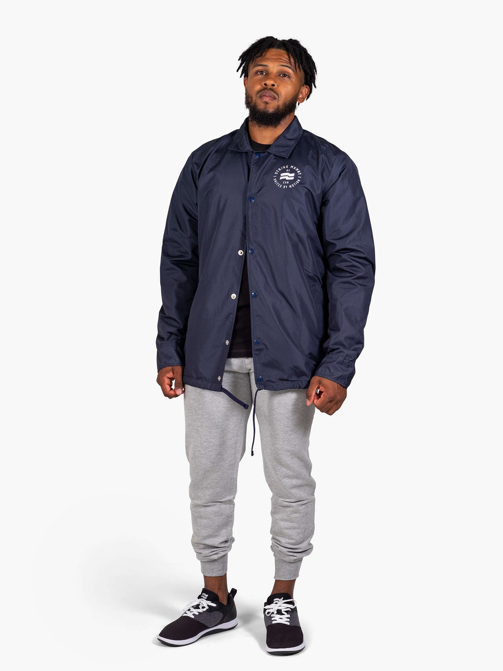 The United By Motion® Coaches Jackets. A throwback piece that will move you forward through crisp mornings and post workout cool downs. Velvety nylon, soft cotton linings, oversize draw cords and custom labeling clinches the win.