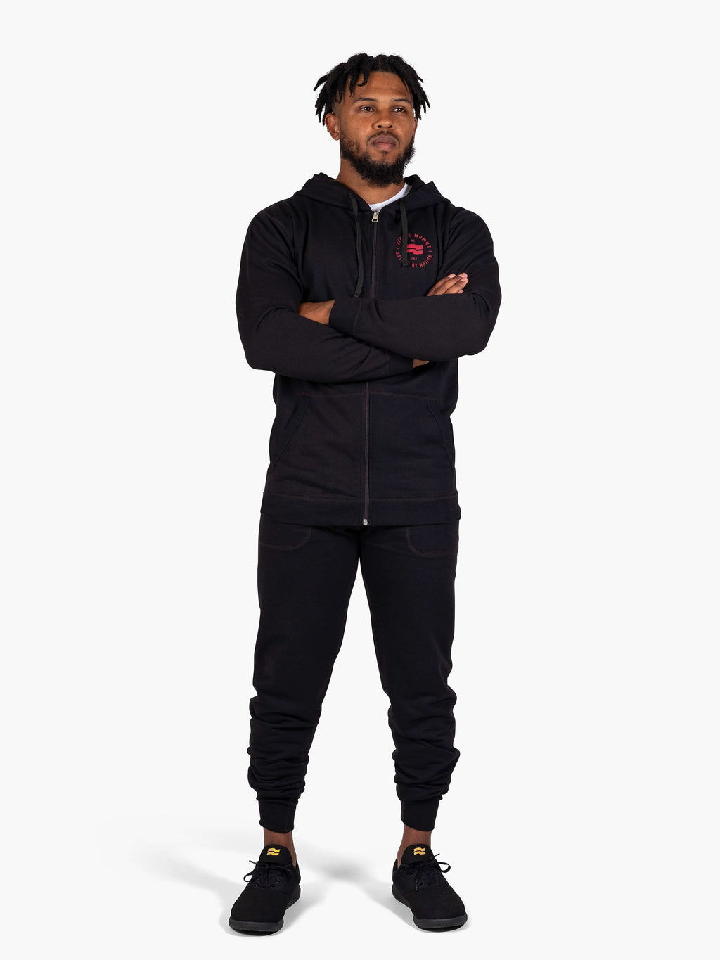 Male athlete is 5'9" (175cm) and wearing size Medium. Shown with the Mobil Sweatpants and Chill Pill Transit Trainers.