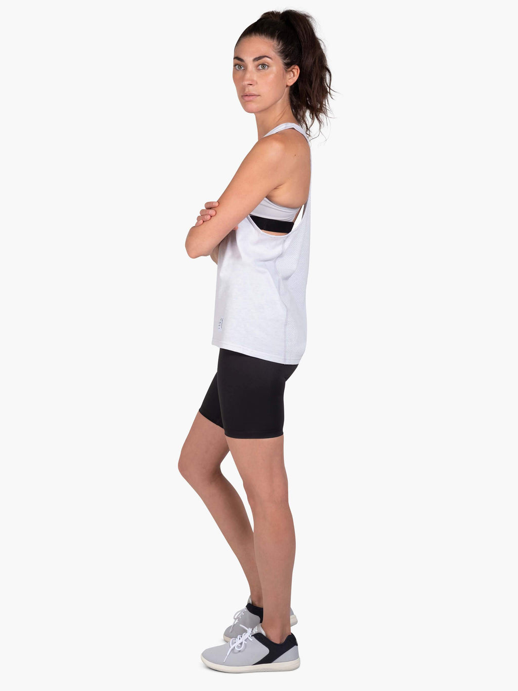 Oversize basketball style tank with dropped arm holes and breathable full mesh back panel. Lightweight coverage with total mobility. Loose fit helps regulate temperature during more intense workouts.